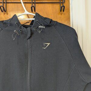 Gymshark Men's Zip-Up Hoodie in size S. Black slim sport hoodie with a zippered pocket in the back. 73% Cotton, 27% Polyester. Some signs of wear.