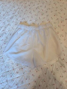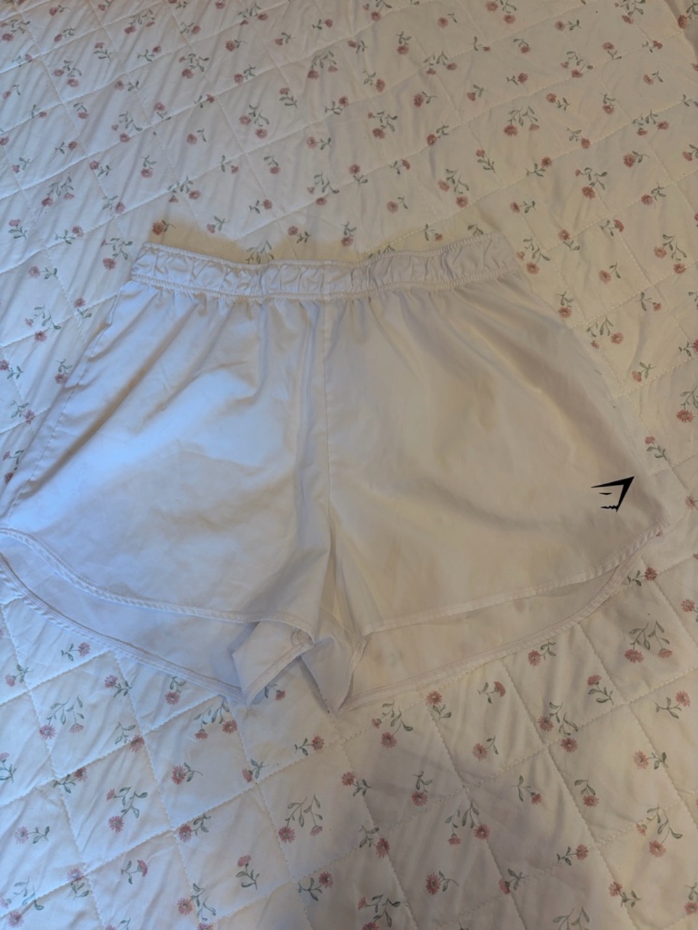 Soft white athletic shorts with elastic waistband. Breathable fabric for active use. Slight curved hem for easy movement. Small Gymshark logo at hem for subtle branding.