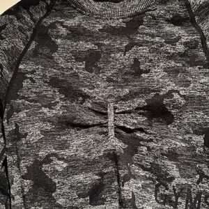Black and grey camo gymshark sport top!! Brand new almost never worn (two times max), authentic gymnshark! Has thumb holes and details on the back of the shirt