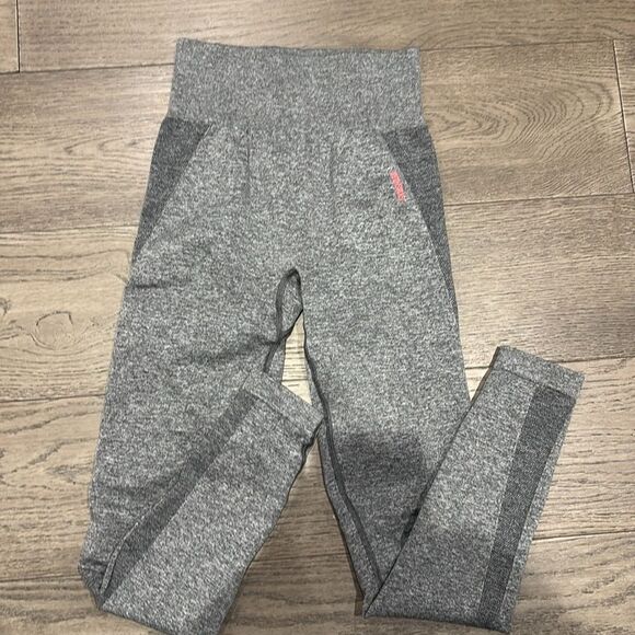 Grey gymshark high waisted grey leggings with pink writing