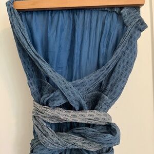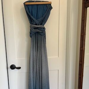 Floor length open back tube dress with long ties to wrap around dress and open back in whatever style you like (can just do around waist or criss cross around the open back). 100% silk under layer with silk chiffon overlay. Worn once.