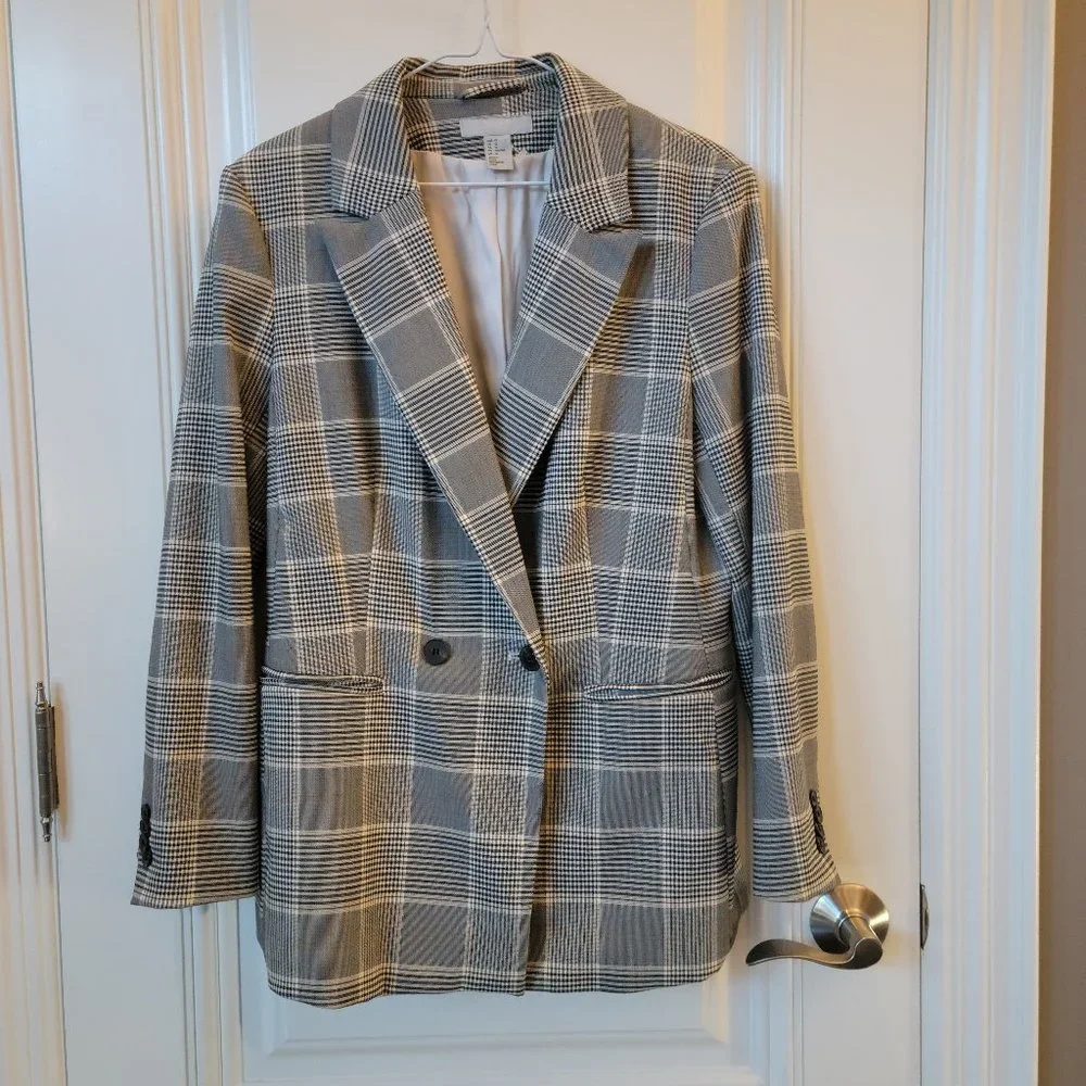 H & M, EUC, Size 12, fully lined, double breasted blazer, with double welt faux pockets, notch collar extra buttons on care tag. In like new condition.