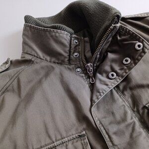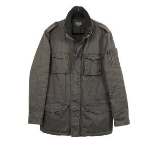 A military inspired field jacket in a traditional olive green hue. Made from cotton with a cozy quilted lining. It’s has an adjustable waist-cord with stopper on the inside. It has plenty of storage space for your essential - 4 front snap-down pockets, interior pocket, and pen/tool sleeve pocket with 5 divisions. Perfect for fall and winter. Great pre-owned condition.