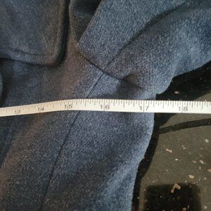 H & M, Like New, size 4, blue double breasted, 3 button, fully lined peacoat, 2 front concealed slip pockets, cuff details, snap closure at collar to allow you to wear collar all the way up per pic. Has the look and feel of wool, with great structure. 86% polyester, 12% viscose, 2% elastene