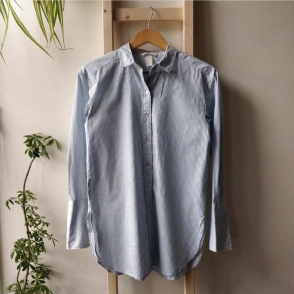 Menswear inspired pinstripe button up blouse from H&M. Light blue and white stripes, 100% cotton, great condition. Size 4, Hi-Lo style hem with slits up the sides. Big sleeve cuffs perfect for rolling or wearing down, tuxedo style.