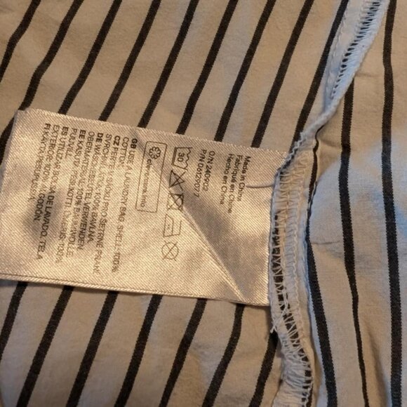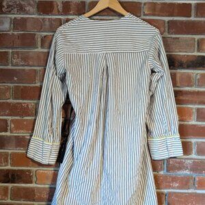 Striped wrap-front dress in airy, woven organic cotton fabric. V-neck, fabric strap at one side with plastic fastener, and yoke at back with pleat. Long, wide sleeves and wide cuffs with buttons. Unlined.