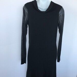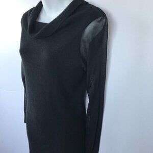 H by HALSTON LBD, black stretchy knit dress, cowl neck, mesh sleeves, sz M