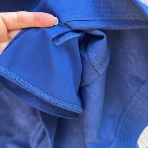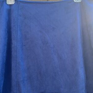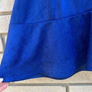 Stunning faux suede skirt by H Halston. Rich blue colour with a peplum hem with stitching detail running around the hem. Zipper at back for easy on/off. Skirt is lined from waist to start of peplum hem.
