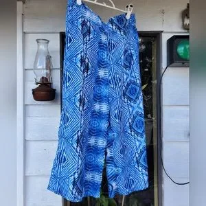 Lightweight, flowy capris with bold blue and black design. Waist 16” with elastic in back. 100% polyester
