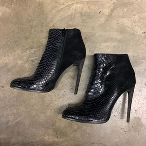 Black leather snakeskin panel ankle boots from Haider Ackermann featuring a round toe, suede panels and a high stiletto heel.