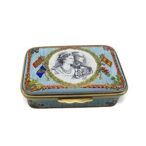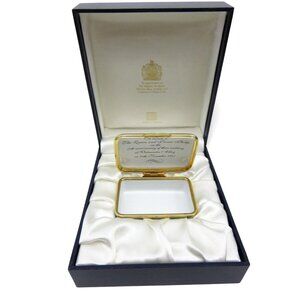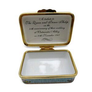 This exquisite Halcyon Days enamel box, crafted in England, commemorates the 50th wedding anniversary of Queen Elizabeth II and Prince Philip.