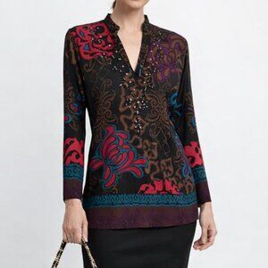 This gorgeous top is a work of art 🙌 Vibrant long-sleeve top with intricate patterns. Features a mix of red, blue, and purple designs. Perfect for a bold look. Sorry to let it go but it’s too small for me. Someone needs to enjoy it