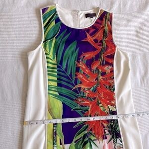 This Hale Bob Tropical Print Tunic Dress is in very good, pre-owned condition. Hale Bob is a clothing brand that is known for its bold, colorful designs and luxurious fabrics. The dress is a specific product from the brand that features a tropical print design, likely with bright colors and palm leaves or floral prints. It is a tunic dress, which is a type of dress that falls somewhere between a dress and a top, often with a flowy and loose fit. The dress is made of comfortable, lightweight material, suitable for warm weather. Size small - please see pics for approximate measurements.