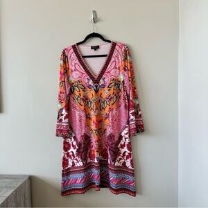 Hale Bob is know for it's uniquely printed and feminine designs, and this bright coloured dress is no exception to that. With the feminine V-neck this dress is super modern and suitable for many different occassions. - Three quarter sleeves