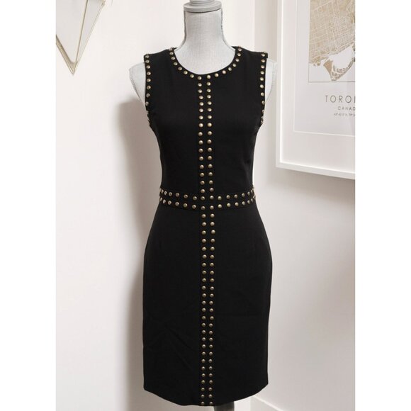 Corporate goth body hugging fitted solid black dress with antiqued brass dome stud hardware trim. Zipper closure, knee length and office appropriate. Polyester/rayon/spandex blend, made in China
