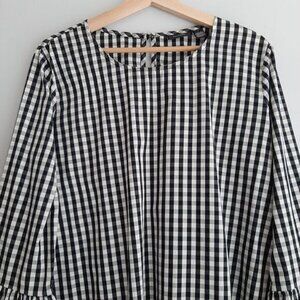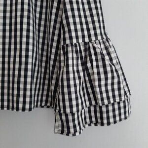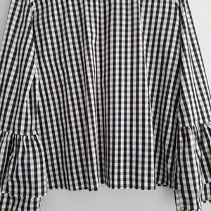 • Long sleeve crew neck top in black, white and grey gingham pattern with ruffled bell sleeves and back yoke button closure.