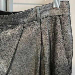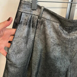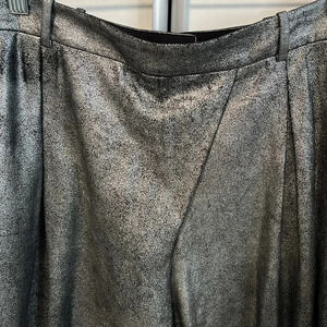 The perfect luxurious skirt/short to add to your wardrobe in a grey metallic 100% leather material. These shorts are draped and dressy. Perfect for the holiday season with a knee high boot and long wool coat. Features 2 side slant pockets, 2 back pockets and fully lined. High rise style with zipper and hook closure at back. Pleated at front with asymmetric pleat in the middle. Excellent condition.