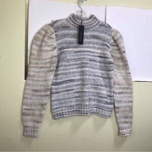 HALSTON NEW Puff Sleeve Sweater Chunky Knit Striped Mock Neck Cozy Wool Blend S