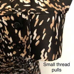 Halston H button up oversized blouse, buttons covered by fabric fold, hidden placket. Bold patterns. Some small thread pulls throughout, the pattern hides these small flaws & overall it’s a beautiful garment. Hem lower in front, longer in back.