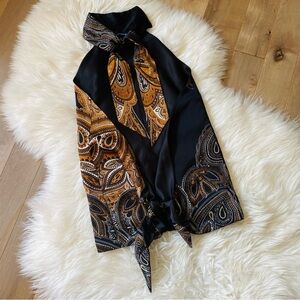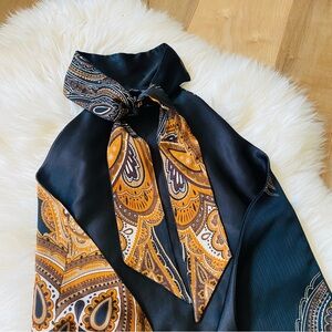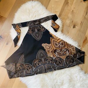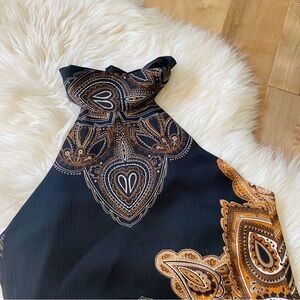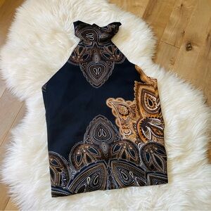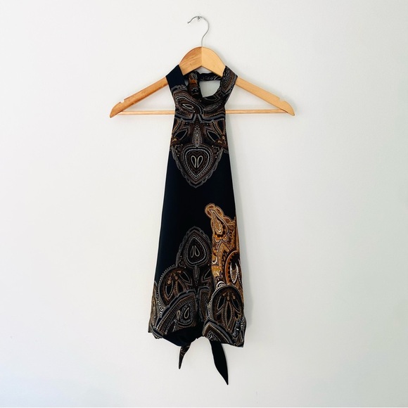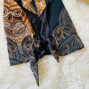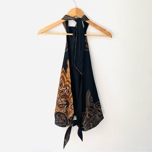 Super sexy turtle neck paisley gold black open back top. Ties at the back of neck and at the back of the waist. Super obsessed with this Y2K look.