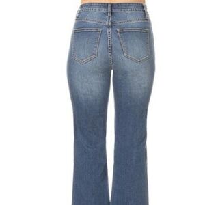 Cropped Wide Leg Jeans In medium blue with hand sand and whiskers. Flared leg style with raw edge released hem. Zip fly and button closure.