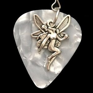 Composition: Pearlized celluloid guitar pick, metal alloy pendants