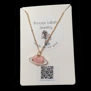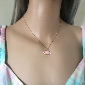 Colour: Gold plate chain, with metal alloy trimmed pendant with pink and white enamel