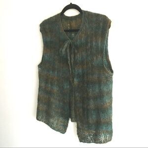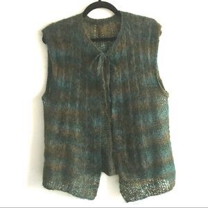 HAND KNIT Mohair Sleeveless Cardigan Sweater Tie Neck Blue Green S/M
