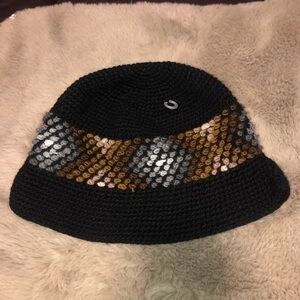 Hand Knit Bucket Hat Black w Grey Brown Diamond Pattern Made in Peru