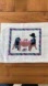 Hand made cross stitch picture unframed on cream colour linen. Border looks like flying geese quilt pattern. Centre depicts an Amish boy and girl seated on benches at a table in prayer. Pie on the table and hearts along the edge with some books underneath the table. Nicely finished on the back.