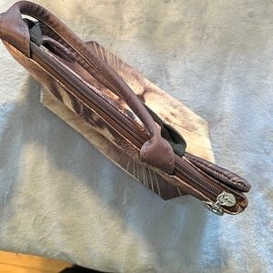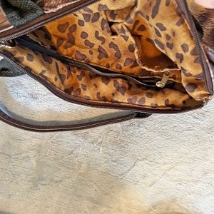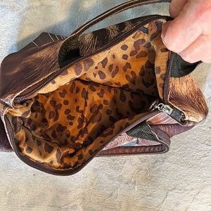 INSIDE: On right is a zipped section just about the whole side of the purse, on left are two open fabric pockets.