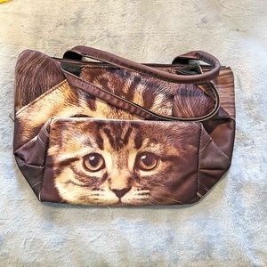 HANDBAG, CAT FACE ON BOTH SIDES & BOTTOM, TOP ZIPPER, PVC OUTER, SHORT HANDLES, FULLY LINED, 3D CAT'S EARS ON FRONT, POCKETS & ZIPPED SECTION INSIDE, NEVER USED