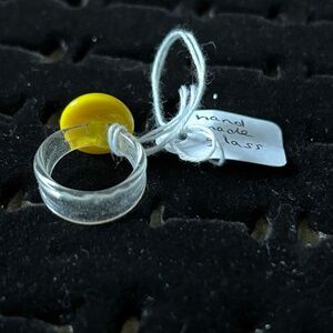 HANDBLOWN GLASS RING, HAPPY FACE, LADIES SIZE 6, CLEAR WITH YELLOW AND BLACK,UNIQUE NEW, TAGS ON