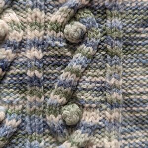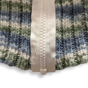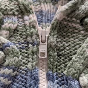Beautiful handknit cardigan sweater with zipper and hood, approximate size is a medium.