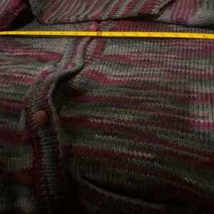 HANDKNITTED CARDIGAN BUTTON UP FRONT ALL BUTTONS THERE .. TWO POCKETS FRONT BOTTOM .. CHEST MEASURES 44 INCHES VIA TAPE MESSURE … NO TAGS ON CARDIGAN , HAS BEEN STORED AND NOT WORN … COLORS ARE BEAUTIFUL ..