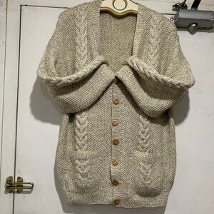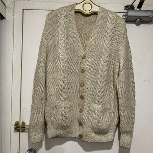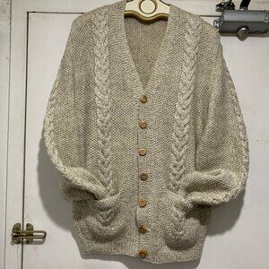 Handmade Unisex Knit Cardigan Sweater, Missing Size Tag, Fit Size L, Color Tan, 100% Wool Front Pockets, Closure Button Down, Good Condition, Brand New, Casual Cardigan, Great Look, Great Fit.