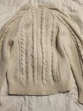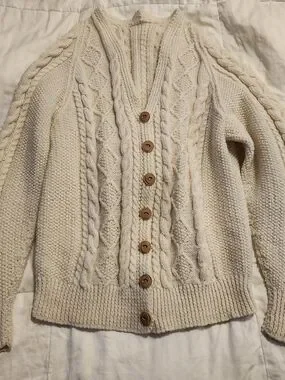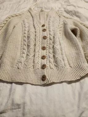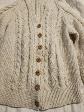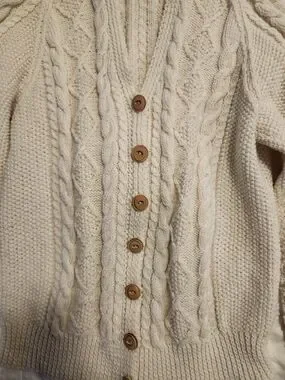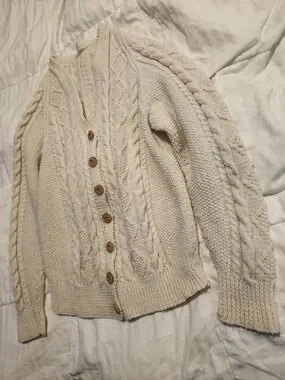 100% acrylic soft cream cable knit sweater cardigan with wooden buttons. Features classic Aran-style cable detailing and a flattering V-neck. Cozy, warm, and versatile for layering. Easy to pair with jeans or skirts for a polished casual look.