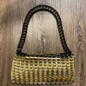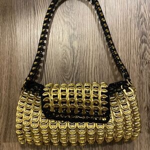 - Gold metal purse hand crafted from up-cycled aluminum tabs crocheted together with black yarn