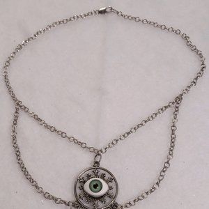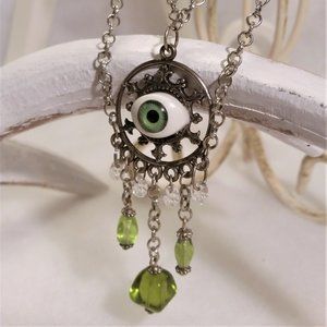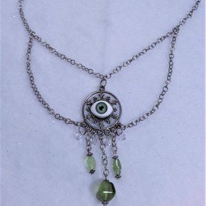 Silver-tone metal necklace with several chains and a magnificent Antique Brass Stampings adorned with a doll's eye with a green iris as well as several translucent or green glass beads.