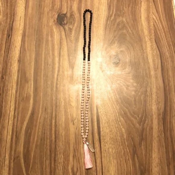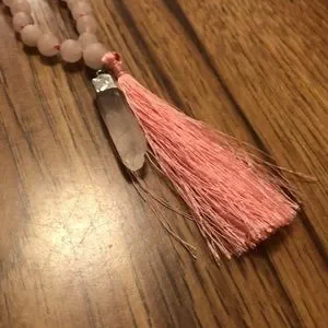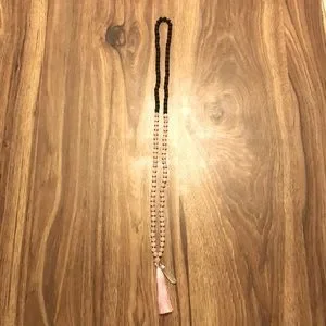 Mala necklace HANDMADE with 48 lava beads and 61 rose quartz crystal beads. Pink tassel at the end with clear quartz pendant. Perfect for setting intentions and for use during yoga and meditation practices.