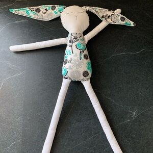 Adorable, baby safe, handmade rag doll bunny. Features a minimalist embroidered face, long arms and legs, and a fun teal, black & grey patterned fabric on the ears and torso.