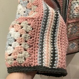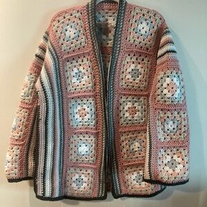 HANDMADE Sz L-XL Granny Square Motif Oversized Open Front Cardigan. Gorgeous cardigan made by hand by me. Soft colour palette contrasted by a dark border. Fits up to a size 18. Perfect grandmacore, Balletcore, prairicore vibe. Made with acrylic yarn for ease of care and durability.