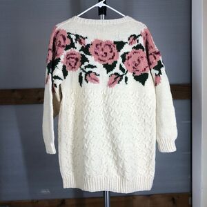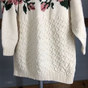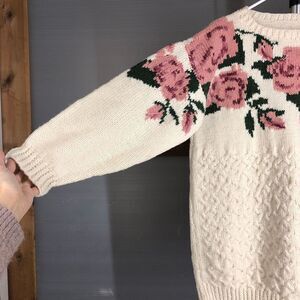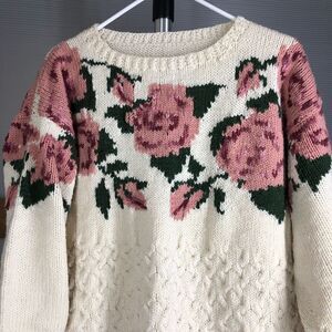 HANDMADE Wool Blend Cream Chunky Cable Crewneck Knit Rose Floral Fisherman Sweater Design Sz M/L/XL
