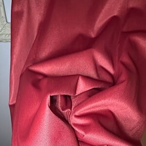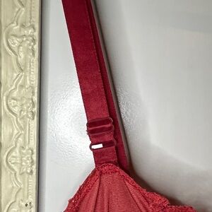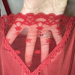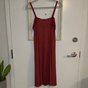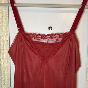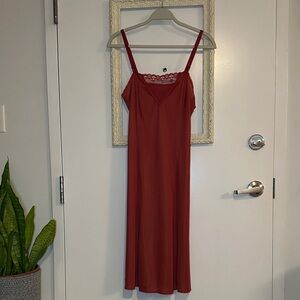Stylish red slip dress with lace trim. Perfect for a chic look.