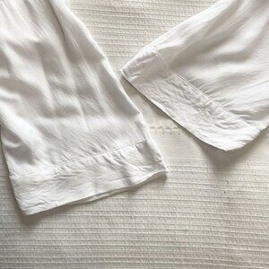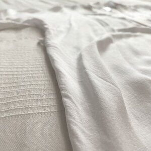 HANRO WHITE WRAP SURPLICE BELTED TUNIC ROBE, this is a super lightweight somewhat sheer white kimono style blouse - wrap surplice style with half dolman sleeves with a drop shoulder style - wrap inside at waistlien and have removable belt to tie at waistline for a cute detail. Unlined - not stretch yet loose fit / relaxed fit. Comfy yet sleek, chic, sophisticated- collarless - v-neck. Perfect business to business casual top with trousers or pencil skirt or just a cute casual top with a jeans a cute flats for a week-end with friends and family.