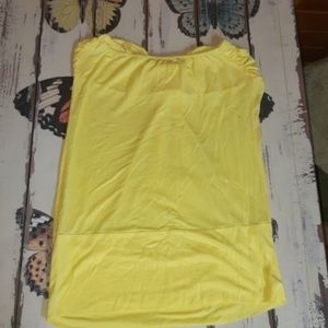Fun top in yellow features wide waist band, pleats down front and elasticized top. 1/4" discoloration on back at waist as shown. 100% rayon size M