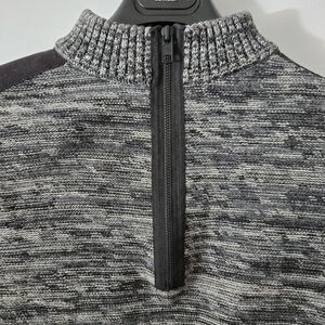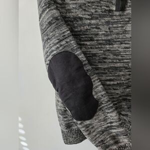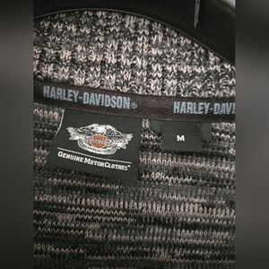 Amazing Harley sweater with a mock neck and half zip. Harley logo on the back. Branded sleeve. Elbow patches are shaped like skulls. Nice, warm midweight sweater.