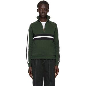 Long sleeve panelled cotton fleece sweater colorblocked in green, black, and off-white. Rib knit stand collar, cuffs, and hem. Half-zip closure featuring hoop hardware at front.