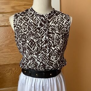 Dramatic floral pattern on a sleeveless top by renowned brand, Harvé Benard. Known for timeless designs and quality craftsmanship, Benard's signature pieces transition seamlessly from workdays to weekends. This chocolate brown and cream blouse is crafted in an easy care fabric. Its high crew neck and front pleating lend sophistication to an otherwise basic look. The centre back zipper allows for ease and comfort.