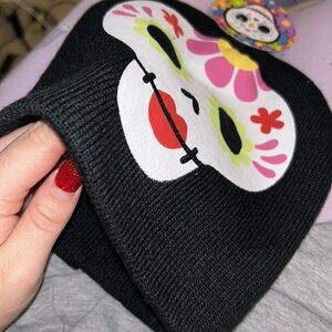 💞 one hello kitty winter hat, one hello kitty bucket hat, one purple leopard print faux fur hat, one sugar skull beanie